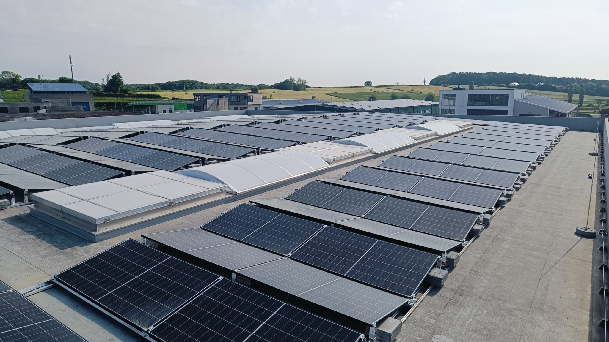L’enjeu du projet consistait à optimiser la production photovoltaïque sur une toiture plate tout en intégrant une infrastructure de recharge adaptée aux usages quotidiens du site.