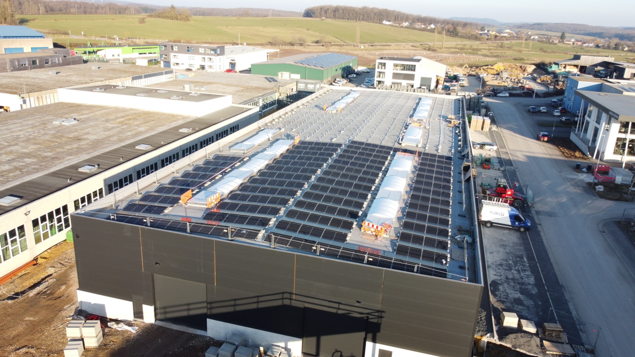 Installation de 736 panneaux photovoltaïques et de 6 points de recharge sur le site des WAKO Offices au Luxembourg. Reno.energy accompagne son partenaire châssis dans l’intégration d’une production solaire et d’une infrastructure de recharge pour ce bâtiment tertiaire.