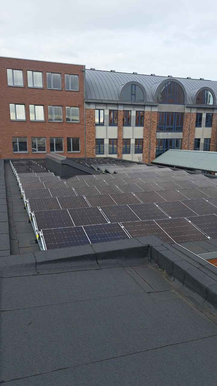 Installation d’envergure en toute discrétion pour l’enseignement secondaire Saint-Lambert à Herstal : 300 panneaux photovoltaïques, étude de stabilité et contrat de maintenance long terme.
