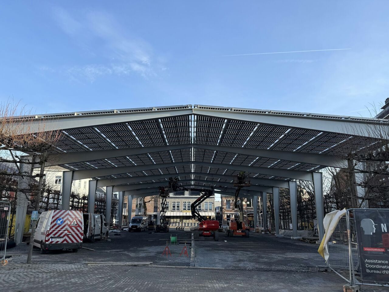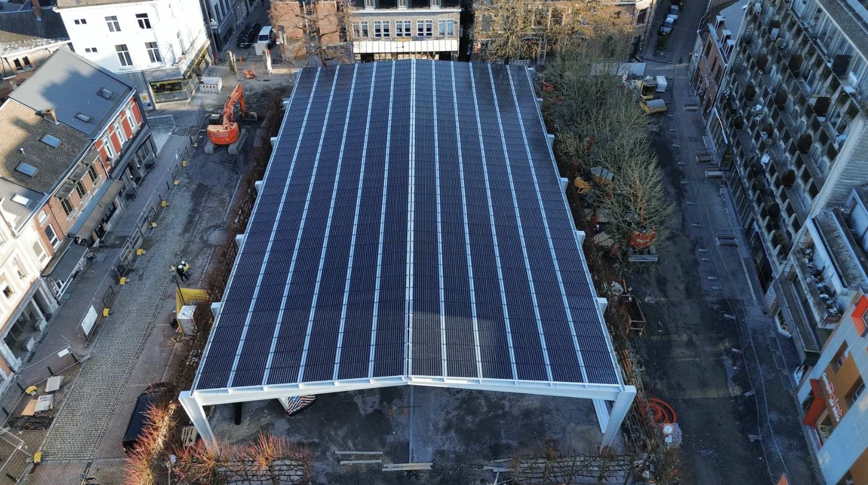 432 zonnepanelen herdefiniëren de Halle aux Foires in Marche-en-Famenne: een fotovoltaïsche overkapping die het gemeenteplein transformeert in een geïntegreerde centrale voor hernieuwbare energie.